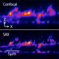 左図は細胞内アクチンの観察像(xz断面)です。従来法(Confocal)では観察できない微細構造も、飽和励起(SAX)顕微鏡では観察可能です。