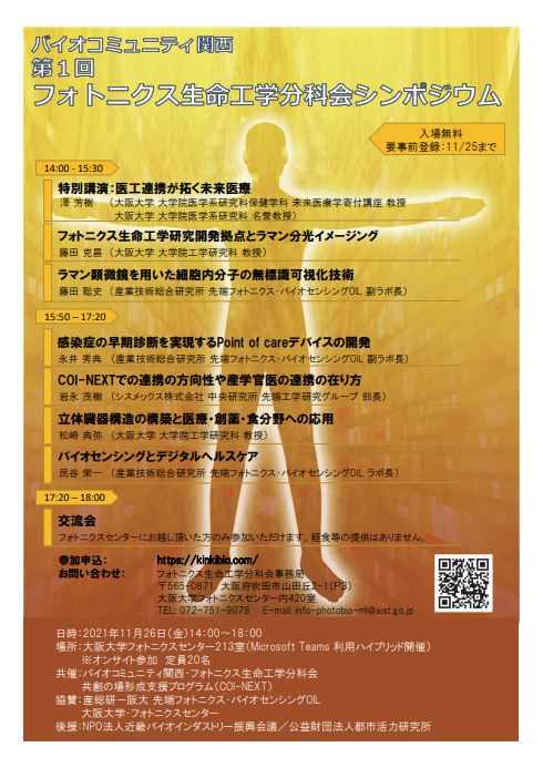 2021年11月26日(金)に、バイオコミュニティ関西 第1回フォトニクス生命工学分科会シンポジウムが開催されます。