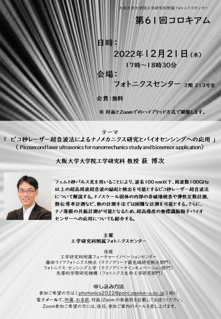 2022年12月21日(水)17:00より、第61回フォトニクス・コロキアムを開催いたします。