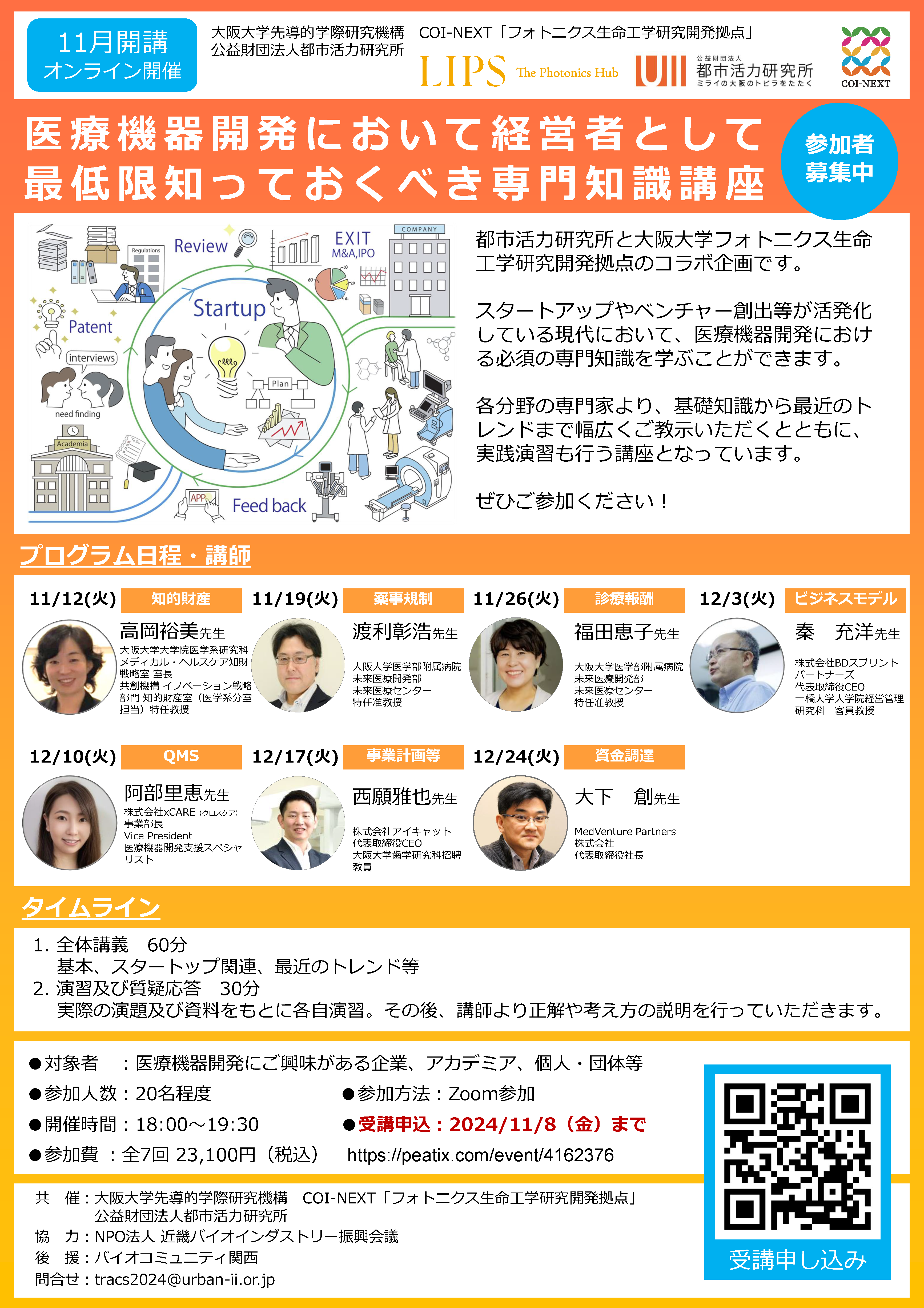 本講座は、医療機器開発の基礎から最新のトレンドまでを網羅し、各分野の第一線で活躍する専門家による指導と実践的な演習を提供します。スタートアップやベンチャー企業の台頭が著しい現代において、医療機器開発分野で成功を収めるために不可欠な専門知識と実践的スキルを効果的に習得できる機会となっております。