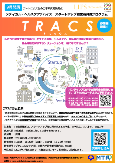 健康で豊かな暮らしを支える医療・ヘルスケアの課題に対して、臨床現場観察等から真のニーズをみつけるとともに、最適なテクノロジーとマッチさせ、さらにスタートアップさせるための経営者に必要な知識を習得することにより、経営者候補生を育成アントレプレナープログラムです。