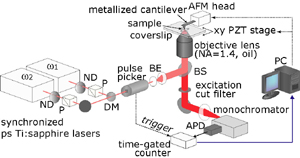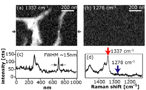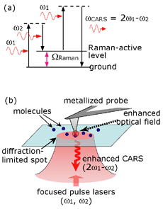 Introduction Light microscopy having a nanometric spatial resolution is a desirable technique for the advances of nanoscience, which provides rich information on molecular species and structures. To attain this attractive tool, we have to break the barrier of spatial resolution due to the diffraction of light wave (= diffraction limit). There are two ways to achieve a super resolution beyond the diffraction limit, near-field optics and nonlinear optics. In this current research, we combine these two techniques in order to make a breakthrough of spatial resolution and small signal sensing. For imaging of molecular vibration, coherent anti-Stokes Raman scattering (CARS) [1], one of nonlinear Raman scattering, is employed. We have realized near-field CARS imaging of DNA molecules. Tip-enhanced CARS microscopy The apertureless type of near field scanning optical microscopy (NSOM) uses a metallic probe with a dimension much smaller than the wavelength of light. The probe tip strongly enhances the optical field at its apex through the excitation of local surface plasmon polaritons. We used this enhancement effect for local amplification of the nonlinear Raman scattering, CARS, in this research [2-5]. The CARS process uses three incident fields including a pump field (ω1), a Stokes field (ω2; ω2 < ω1), and a probe field (ω1), and induces a nonlinear polarization at the frequency of ωCARS = 2ω1-ω2, as shown in Fig. 1(a). When the frequency difference of ω1 and ω2 (ω1-ω2) coincides with one of specific molecular vibrational frequency (Ω) of a Raman-active mode of a given sample, the anti-Stokes Raman signal is resonantly generated. When the CARS polarization is induced by the tip-enhanced field, the spatial resolution is essentially determined by the size of the tip (Fig. 1(b)). In addition to the tip effect, owing to the third-order nonlinearity of the CARS process, the excitation of CARS polarization can be tightly confined and strongly enhanced at the very end of the tip. The tip-enhanced CARS microscope that we developed consists of two mode-locked Ti:sapphire lasers, inverted microscope, and an atomic force microscope (AFM) equipped with a silver-coated cantilever, as shown in Fig. 2 [3-5]. The laser beams are collinearly focused on the sample surface by an objective lens (NA = 1.4), and the probe tip is contacted on the focal spot. The CARS signals generated near the tip are collected with the same objective lens and detected with a photon-counting avalanche photodiode. Tip enhanced CARS imaging of DNA molecules Recently we have realized CARS imaging of a specific vibrational mode of DNA molecules in the fingerprint region [5]. DNA network structure (poly(dA-dT).poly(dA-dT)) was used as a sample, which consists of DNA double-helix containing adenine and thymine bases besides the polynucleotide chain. The network structure was visualized at a vibrational frequency (~1337 cm-1) corresponding to the ring-breathing mode of diazole in the adenines, as shown in Fig. 3(a). The DNA structures could not be visualized at an off-resonant frequency (~1278 cm-1) in Fig. 3(b), which verifies the resonant generation of the plasmon-enhanced CARS signals. Figure 3(c) shows a line profile of a row indicated by the solid arrows in Fig. 3(a). The FWHM (full-width of half-maximum) of the narrower peak at x ~ 700 nm is found to be ~15 nm. Thus, our plasmonic CARS microscope has achieved molecular-vibration imaging with a spatial resolution of ~15 nm and sufficient sensitivity. References